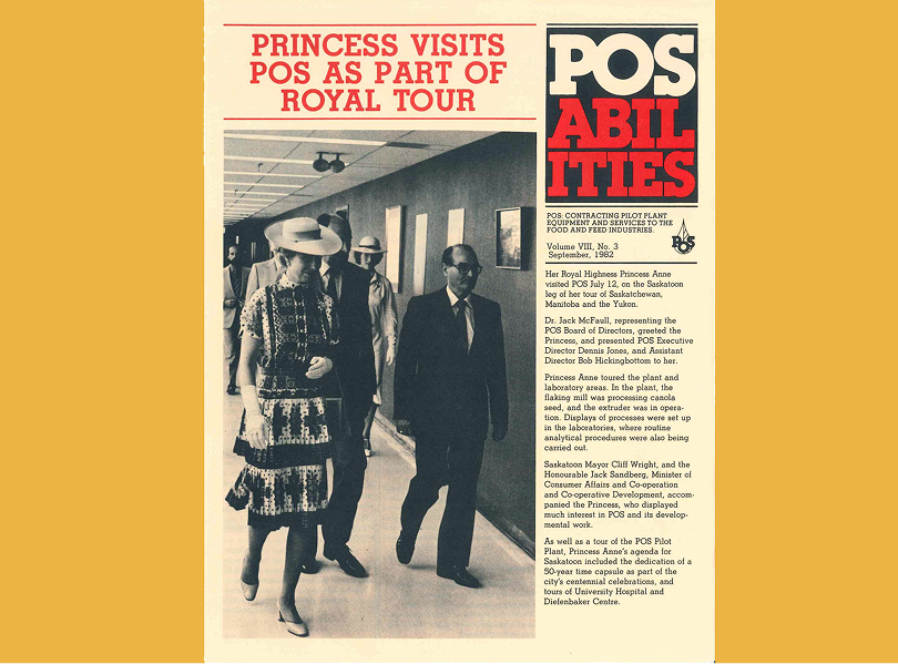 On July 12, 1982, Her Royal Highness Princess Anne visited POS during her tour of Saskatchewan, Manitoba, and the Yukon. While touring the plant and laboratory areas, the Princess observed the flaking mill in operation as it processed canola seed. She was accompanied by the then-mayor of Saskatoon, Cliff Wright, and the Honourable Jack Sandberg. Princess Anne showed genuine interest in POS and its developmental work.